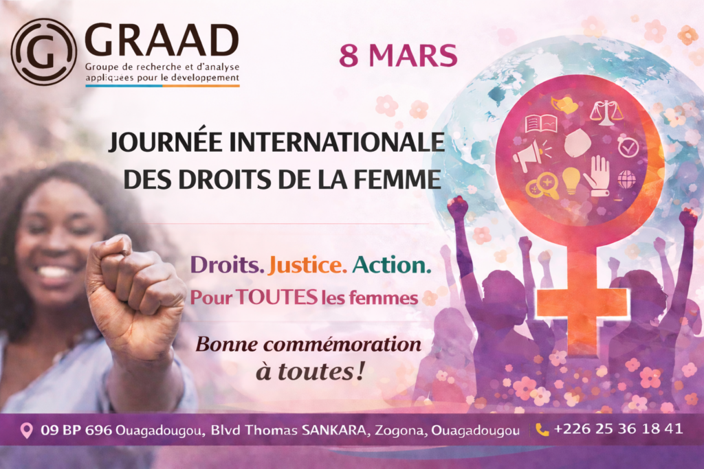 Chaque 8 mars, le monde marque une date essentielle : la Journée internationale des droits de la femme. Pour le GRAAD Burkina, cette journée ne saurait se réduire à un rendez-vous symbolique. Elle est, surtout, une invitation à la réflexion collective — lucide et exigeante — sur l’état des droits des femmes et des filles, sur les obstacles qui persistent, et sur les actions à accélérer pour transformer durablement les réalités.
