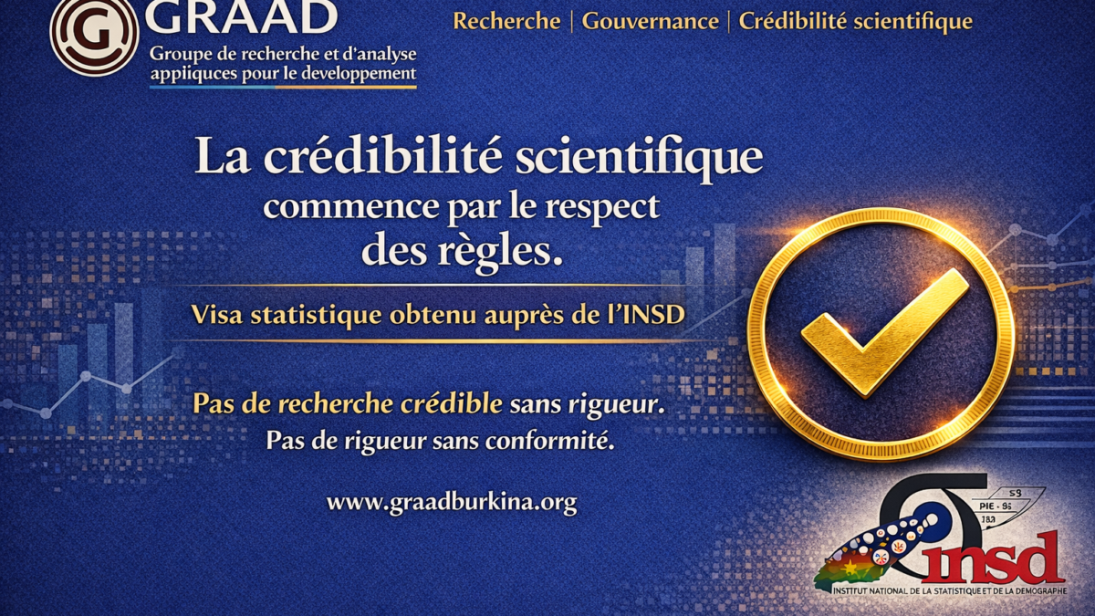 Dans le cadre de ses travaux de recherche, GRAAD Burkina a obtenu le visa statistique requis auprès de l’Institut national de la statistique et de la démographie (INSD), conformément à la réglementation en vigueur au Burkina Faso.